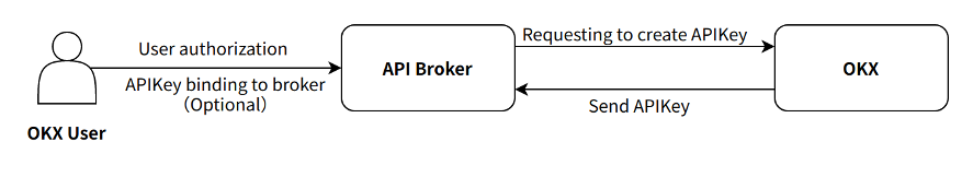After the Broker user logs in on the Broker interface, he can jump to the login OKX page through Oauth authorization. After the login authorization on the OKX page, OKX will authorize the API broker to create an API Key for his user with read-only and trade permissions.